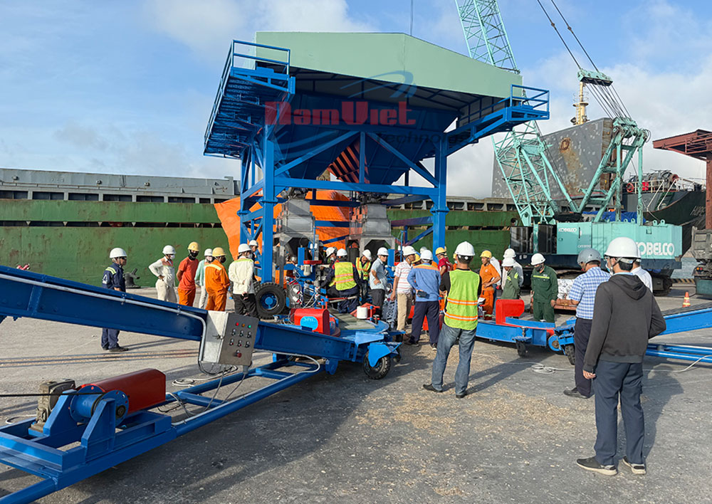 Sau quá trình khảo sát mặt bằng, luồng nguyên liệu và quy trình bốc xếp tại Cảng Quy Nhơn, Nam Việt đã thiết kế riêng một hệ thống máy đóng bao công suất lớn, phù hợp điều kiện môi trường biển và đặc tính phân bón hóa học.