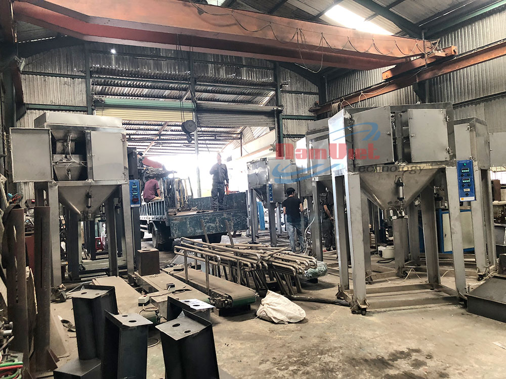 Sau khảo sát thực tế tại cảng, Nam Việt thiết kế và lắp đặt hệ thống máy đóng bao công suất lớn gồm 2 dây chuyền hoạt động độc lập hoàn toàn, đáp ứng tiêu chuẩn cảng biển và năng lực xuất khẩu hiện đại.